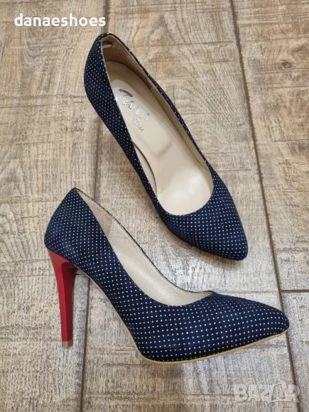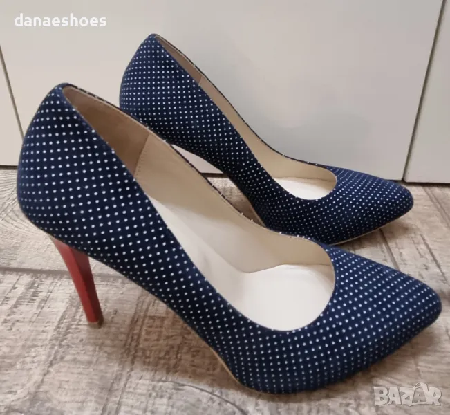 Дамски обувки в синьо на бели точки на висок ток → Обява 50074201