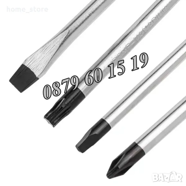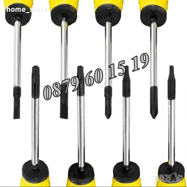 - Прави отвертки: SL3 x 75;SL4 x 100;SL5 x 75;SL5 x 100;SL5 x 125;SL6 x 100;SL6 x 150;SL8 x 150 - 8 бр.