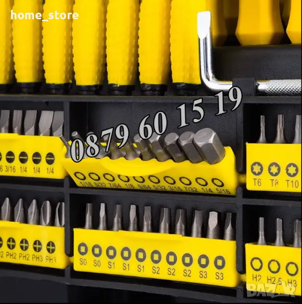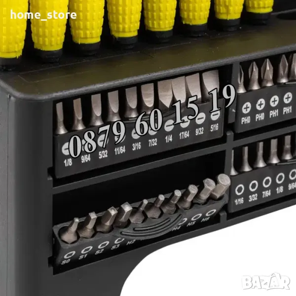 - Битове: 2 х SL3;2 х SL4;3 х SL5;3 х SL6;2 х SL7;2 х PH0;3 х PH1;3 х PH2;2 х PH3;2 х PZ0;3 х PZ1;3 х PZ2;2 х PZ3;1 х H1.5;1 х H2;1 х H2.5;1 х H3;2 х H4;1 х H5;1 х H5.5;2 х H6;2 х T8;2 х T9;2 х T10;2 х T15;2 х T20;2 х T25;2 х T27;2 х T30;2 х T40 - 60 бр.
