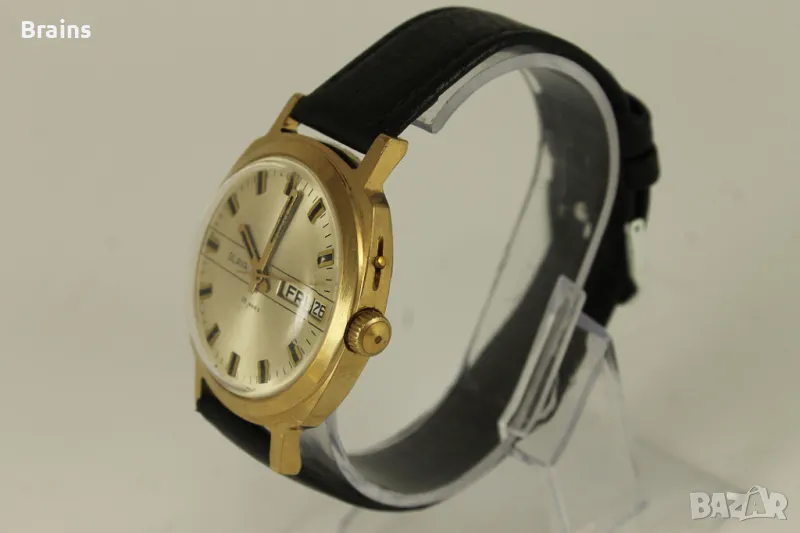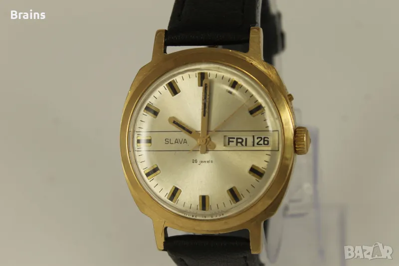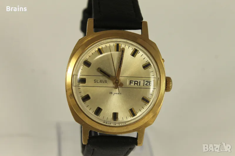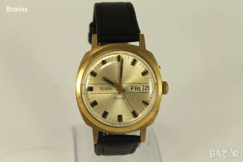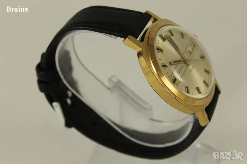 Колекционерски Руски ръчен часовник Slava , калибър 2428 със 26 Камъка. Запазена 10 микрона позлатена каса. Отлично работещ, прехвърля дата. Kожена кайшка.