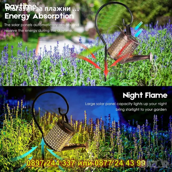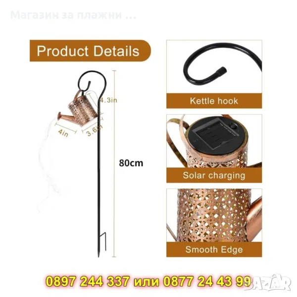 Идеална за декорация на градини, дворове, балкони и алеи, тя се захранва от слънчева светлина и автоматично се включва при здрач. Изработена от устойчиво желязо, лампата е подходяща за целогодишна употреба на открито. Без нужда от кабели – просто я поставете в почвата със стойката и се насладете на очарователната атмосфера.