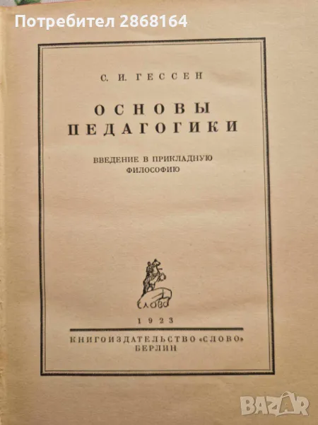 Основы педагогики: введение в прикладную философию. Автор, Сергей Иосифович Гессен, Кн-во Слово, Берлин 1923.Книгата е с колекционерско качество изключително рядка и ценна 1-во издание.В перфектно състояние.От личната библиотека на отец Димитър Мавров.