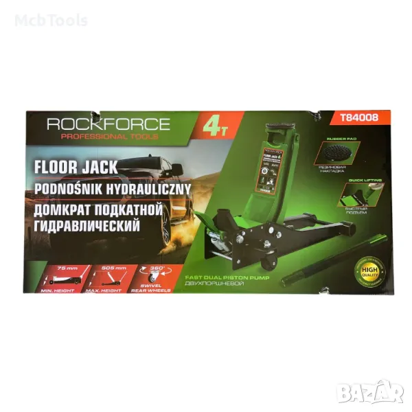 Професионален сервизен крик на марката ROCKFORCE с товароподемност 4 тона, с две помпи и усилена конструкция. Крикът е снабден с педал за бързо повдигане.