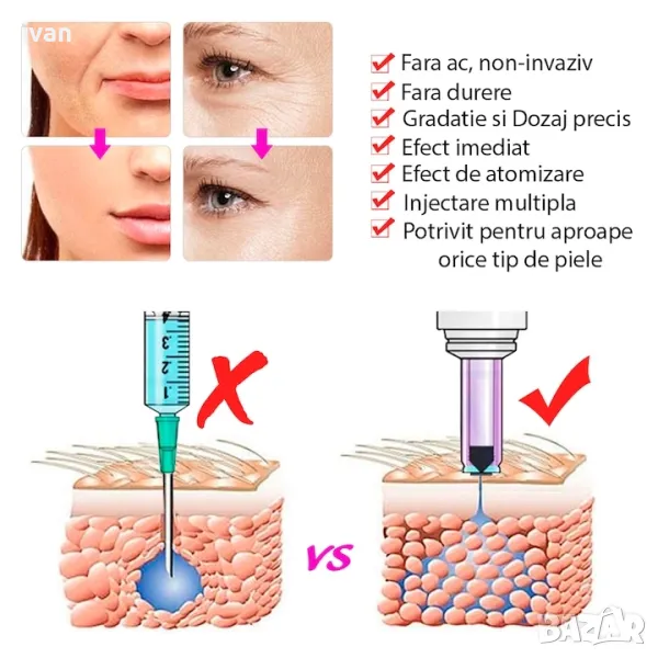 Възможно е да поставяте много малки количества хиалуронова киселина, витамин С или други коктейли за подхранване и хидратация на кожата.