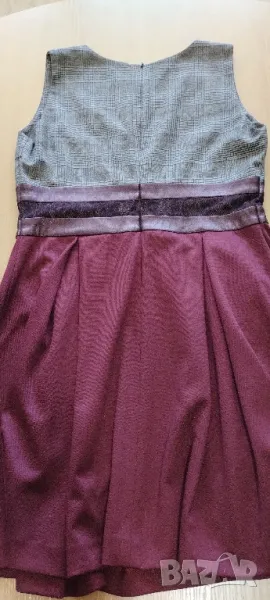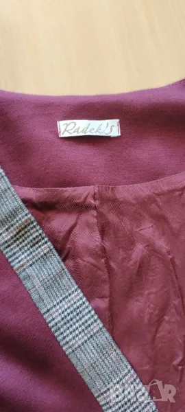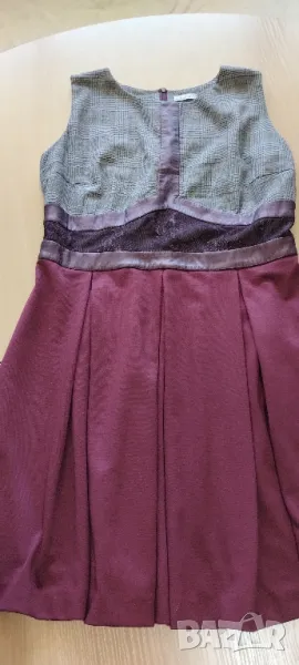 Роклята е от плат,трико,кожа, дантела. Без ръкав.Има сако към нея.Обичана много малко .При интерес ще измеря.