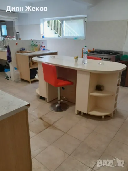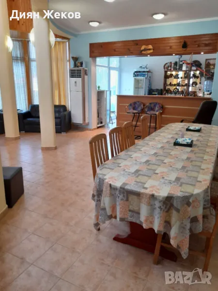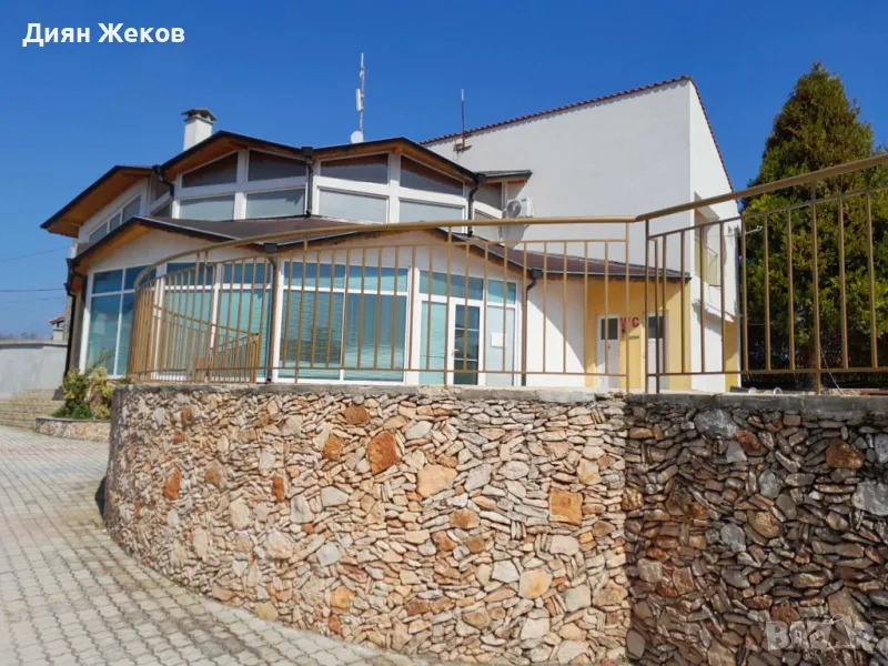 - На 1 етаж : просторен дневен тракт - трапезария с 12 стола,кът за отдих , бар ,помощни и складови помещения , Професионална кухня -напълно оборудвана.Вътрешно извито стълбище към втория етаж.