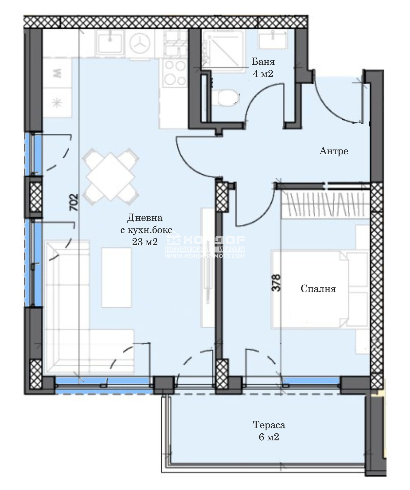Оферта 66823: Предлагаме Ви възможността да закупите двустаен апартамент с изложение ЮГ/ЗАПАД в новоизграждащ се луксозен жилищен комплекс с модерна визия, проектиран да създаде максимален комфорт на живущите в него. Функционално разположени жилищни секции с елегантен силует готов да предложи комфорт и модерен начин на живот. Едно от основните му предимства е страхотната локация, отлична комуникативност и динамична пътна инфраструктура, която осигурява бърз и лесен достъп до комплекса от всяка точка на града. Той съчетава лукс, спокойствие и комфорт с подсигурени паркоместа и гаражи. Жилището се състои от ъглова югозападна дневна 23.46кв.м. с кухненска част и трапезария, една самостоятелна спалня, баня с тоалетна, входно антре и една обща тераса. Основната концепция при проектирането е да се постигнат просторни и функционални стаи, с цел да се създаде максимален уют на модерното семейство. Изключителна съвременна архитектура и модерна технология на строителство. Визията е иновативна, привличаща внимание с уникалността си. Всяко жилище ще разполага с пълно окабеляване за домофон, интернет и кабелна телевизия, общите части са луксозно завършени, жилищата са с алуминиева дограма с троен стъклопакет от най-висок клас, масивна блиндирана входна врата. За удобство на живущите съществува възможността да закупят подземни паркоместа и гаражи с топла връзка към комплекса. Гъвкави схеми на разсрочено плащане спрямо възможностите на клиента в рамките на строителството или закупуване чрез Банков Кредит, на изключително изгодни условия за клиенти на агенцията !!! Приложените изображения са от завършени проекти на строителната фирма.ВИЖТЕ ОЩЕ ИЗГОДНИ ОФЕРТИ НА https://www.kondorimoti.com/ С ЕЖЕДНЕВНА АКТУАЛИЗАЦИЯ!