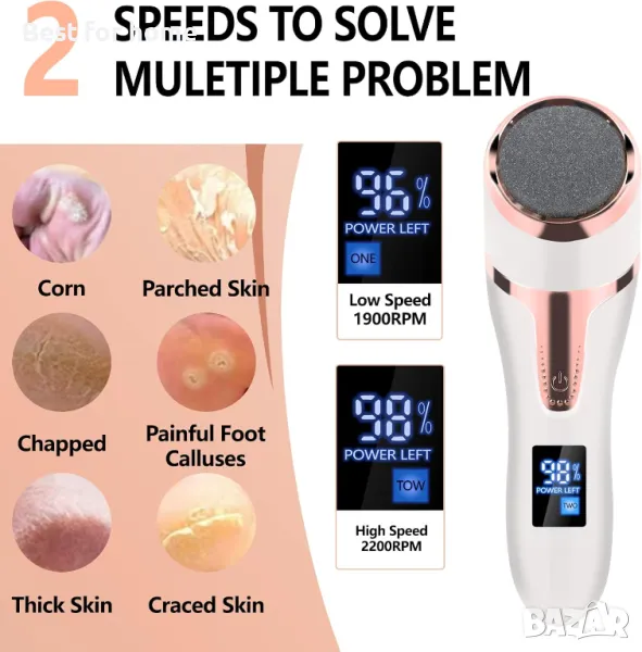 2 скорости с един бутон: Електронната пила за мазоли има мощен мотор с висок въртящ момент. Можете лесно да я превключвате на 2 скорости: 1900 об/мин и 2200 об/мин.
