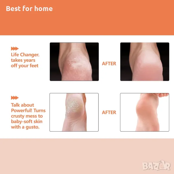 Вакуумно засмукване и разсейване на топлината: пиле за мазоли. Специално разработена вакуумна функция може да засмуче малки кожни мазоли и да предотврати разпръскването им. Отворите в шлифовъчните глави също допринасят за разсейване на топлината и гарантират, че устройствата няма да изгорят от топлината, генерирана по време на работа.