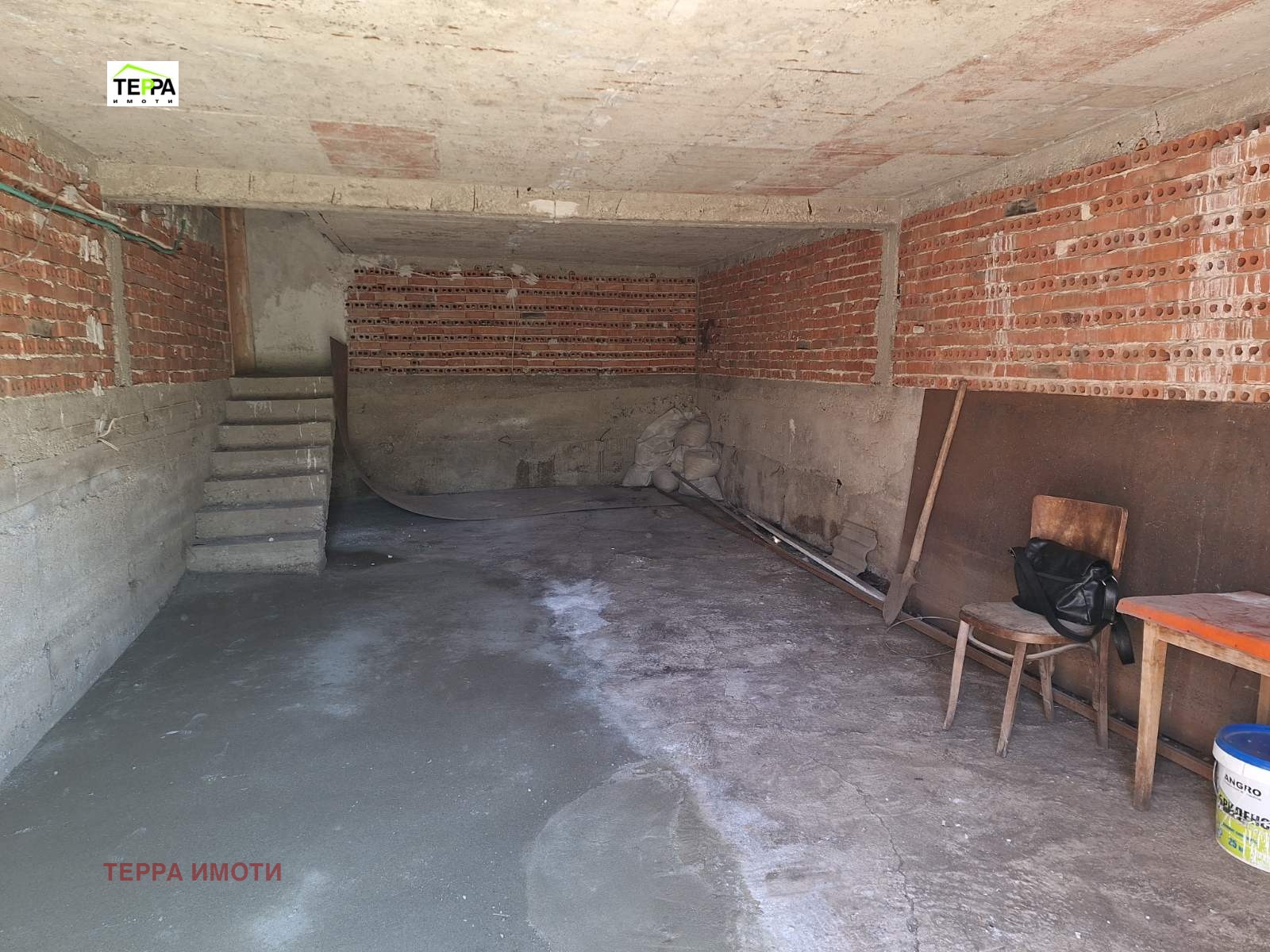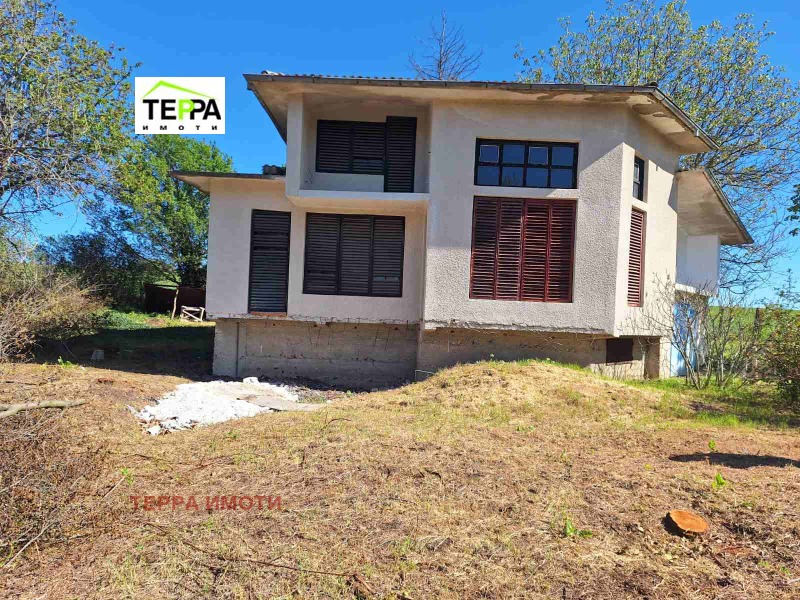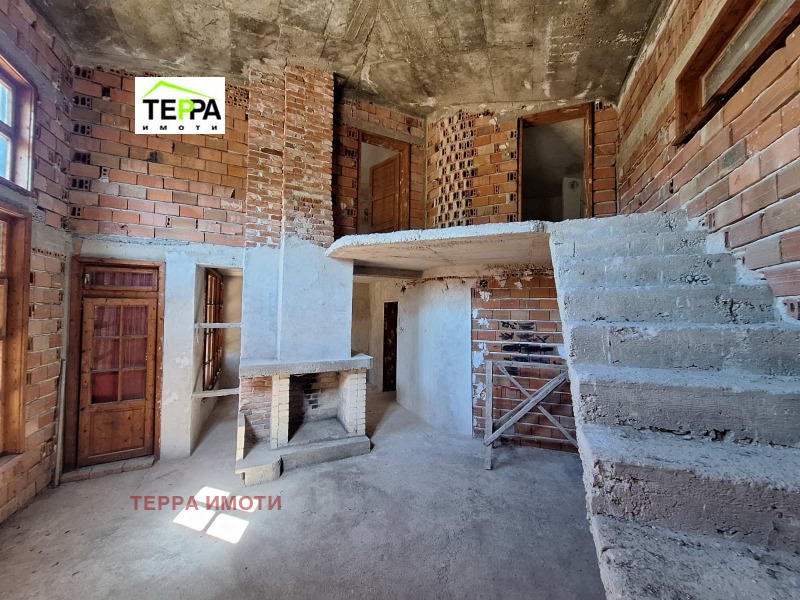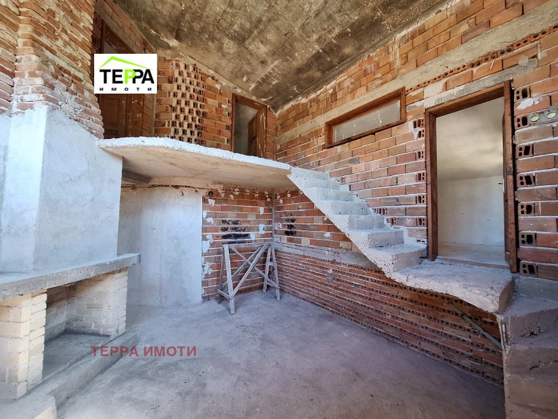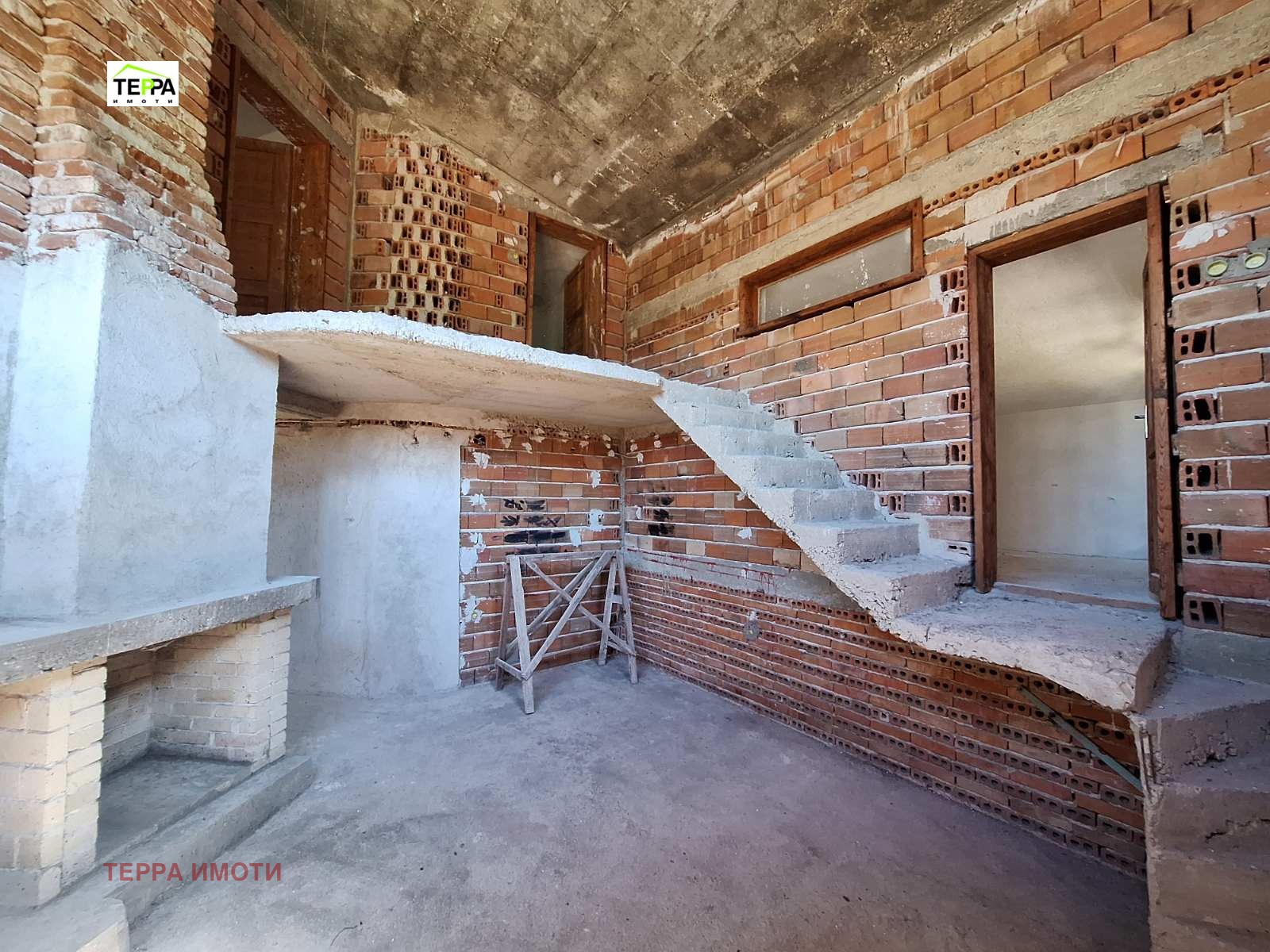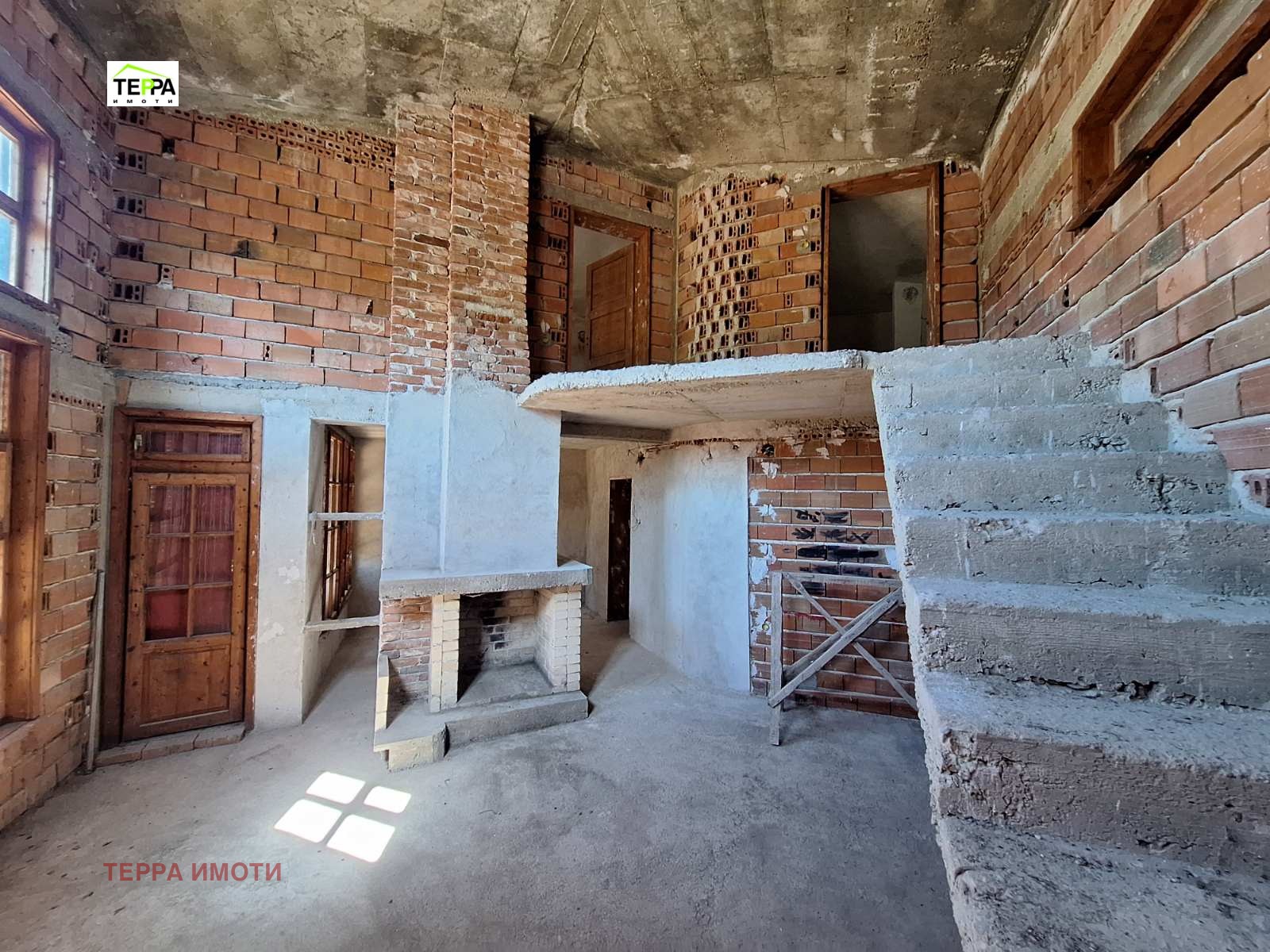 Къщата, която предлагаме е със следното разпределение:Сутерен- две самостоятелни помещения с баня и санитарен възел.Първи етаж-просторна раздвижена дневна с кухненски бокс, изградена камина, баня и санитарен възел.Вътрешни стълби отвеждат към полуетаж с две преходни стаи предвидени за спалня и голям дрешник.Вторият етаж включва две помещения- предвидени за спалня и втора баня.Къщата е на груб строеж, измазана отвън и частично отвътре, има нужда от допълнителни строителни дейности.Към нея има голям двоен гараж, с топла връзка!Разположена е в двор от 1400 кв.м, с декоративна растителност и множество орехови и лешникови насаждения, плодни дръвчета и храсти.В двора има бита сонда.Стари партиди за ток и вода.При сериозен интерес договаряне на цената!