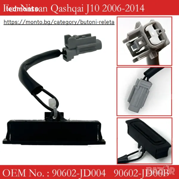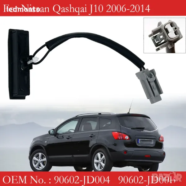 бутон за отваряне на багажника, съвместим с Nissan Qashqai J10 и Нисан Кашкай, произведени между 2006 и 2014 година. Частта е с оригинални референтни номера 90602-JD004 и 90602-JD00B.