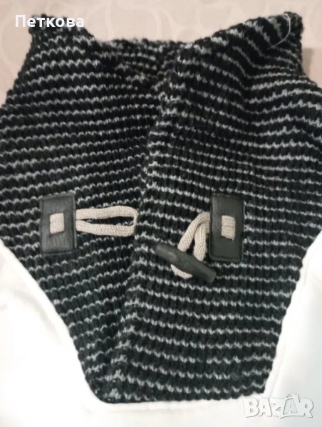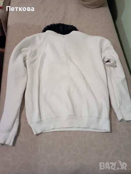 Нов ватиран пуловер в бяло с ефектна яка и закопчаване. Удобен, топъл и подходящ за различни поводи. Яката е черно и сиво, черно копче при закопчаването.