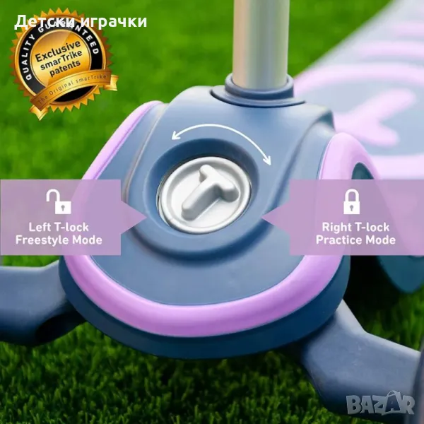 В първия етап на използване на кормилото на скутера се блокира от T-lock системата. Кормилото не може да се върти, така че детето се чувства безопасно по време на шофиране, бавно се учи да шофира самостоятелно.