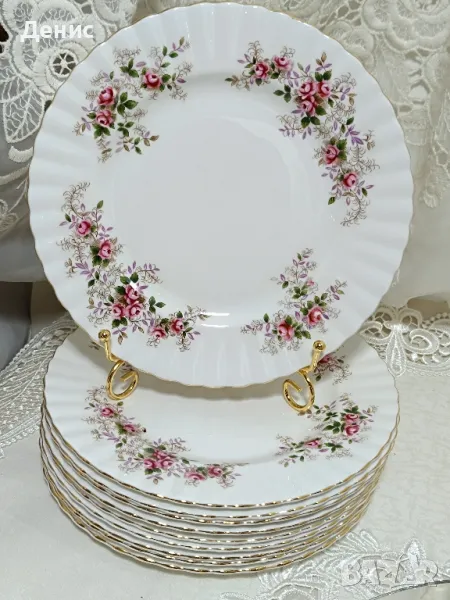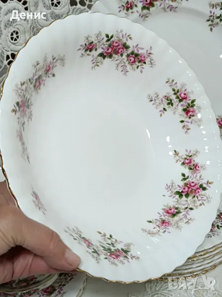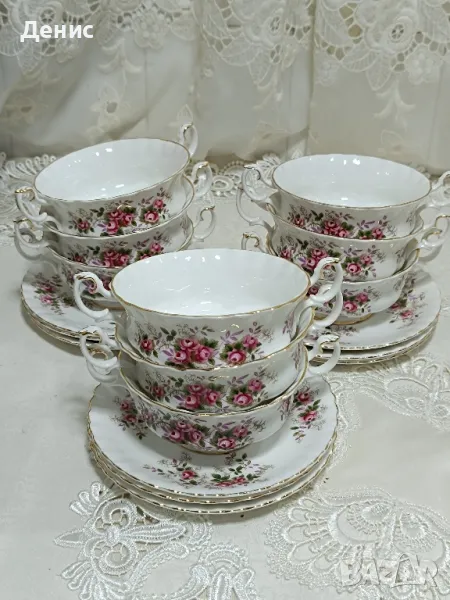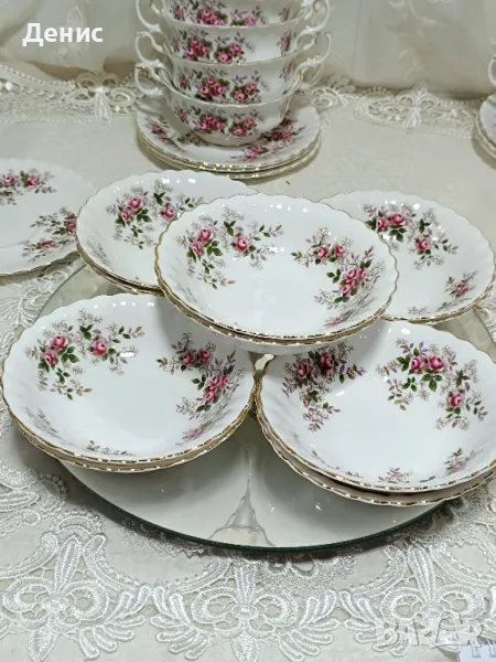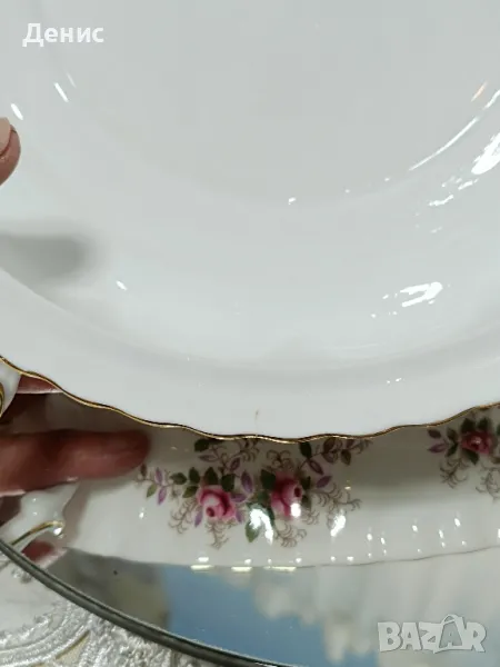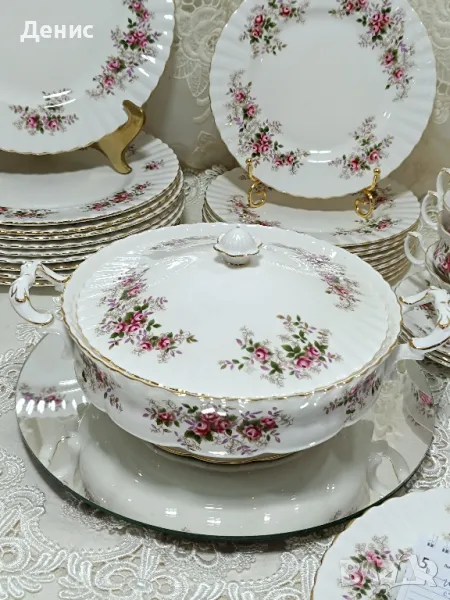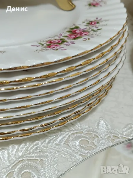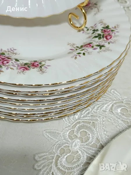 костен порцелан с розови рози в златен кант.А с формата" Mintrose "-вълнообразен ръб ,прави частите деликатни и неустоими .Мекия и топъл бял цвят създават много нежност и романтика.Всяка част от серията е ръчно украсена с 24-каратово злато.Цветовете носят усещаше за уют, елегантност и деликатност.Луксът е с показност,но не е претенциозен-това е красота за ценителите на елегантност .Lavender Rose не е просто сервиз-той е емоция ,спомен,покана за красиви моменти.💥Сервиз за хранене за 10души🌹Основна чиния с Ф 26-10бр.Цена за брой 40лв.🌹Десертни чинии Ф2010брЦена за брой 20лв 🌹Съд за топло сервиране около 2л./малко косъмче-вижте снимката,незабележимо/Цена съобразена с дефекта 100лв.🌹Дълбоки купи Ф 24см.3брояЦена за брой 70лв.🌹Плато 33см./26смЦена 50лв.🌹Купички десертни 200мл 10брЦена за брой 15лв.🌹Купички с дръжки за супа с подложна чинийка 300мл.9бр.Цена за брой 45лв 🌹Сосиера 2бр 🌹Подложни чиний 2бр за сосиера 2бр,може да се ползват и за друго.Двете сосиери с чинийките са подарък.Сервизът се продава цял ,цените съм добавила за ориентир .Ако се заявят всички части от различни хора,мога да го продам и на части. 💥 ЦЕНА 1510лв💥Състояние: Частите са ползвани само по празници и са в прекрасно състояние. Свеж порцелан с перфектни златни кантове и ярък декор.Опаковането е от мен и се пригответе за борба с тиксото.😜