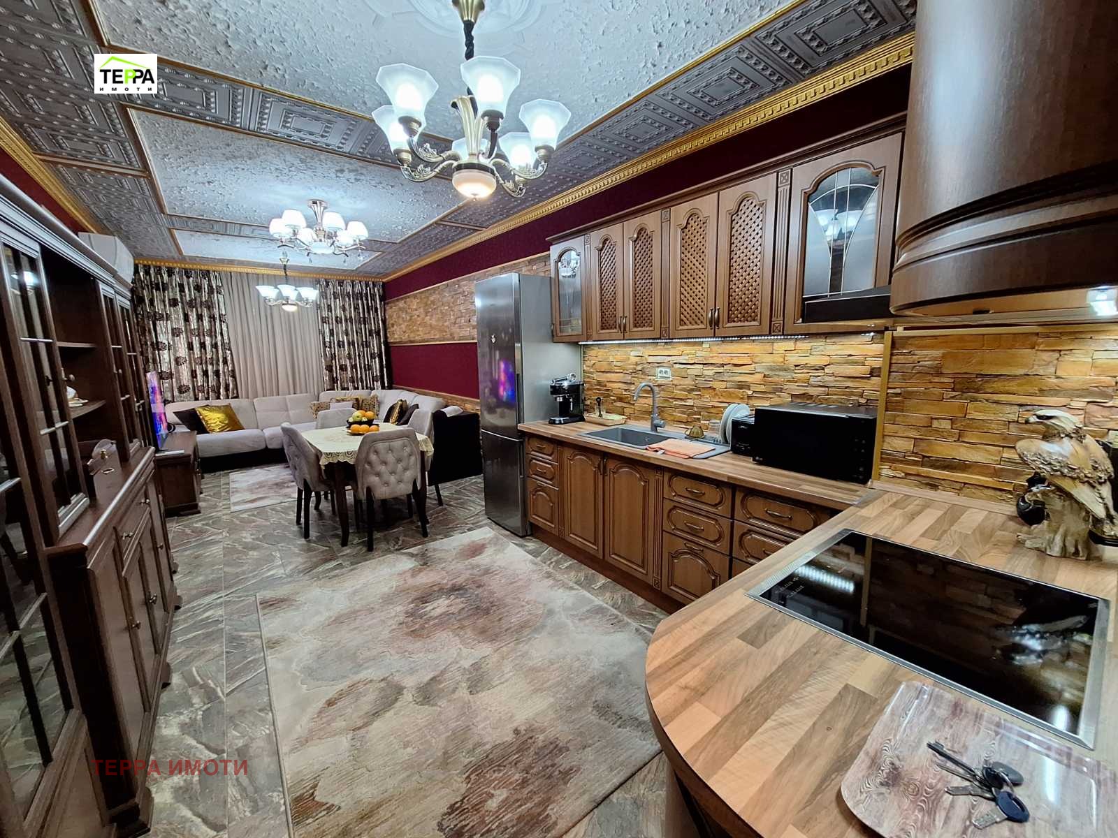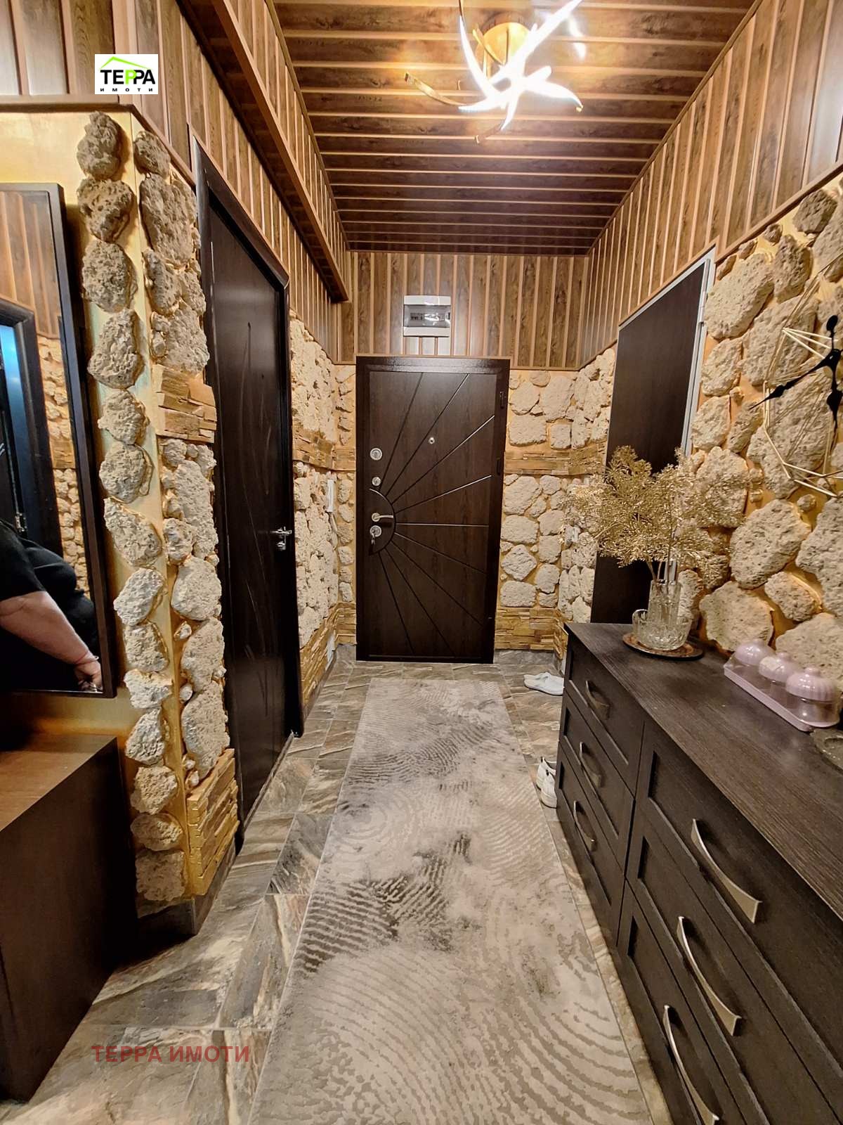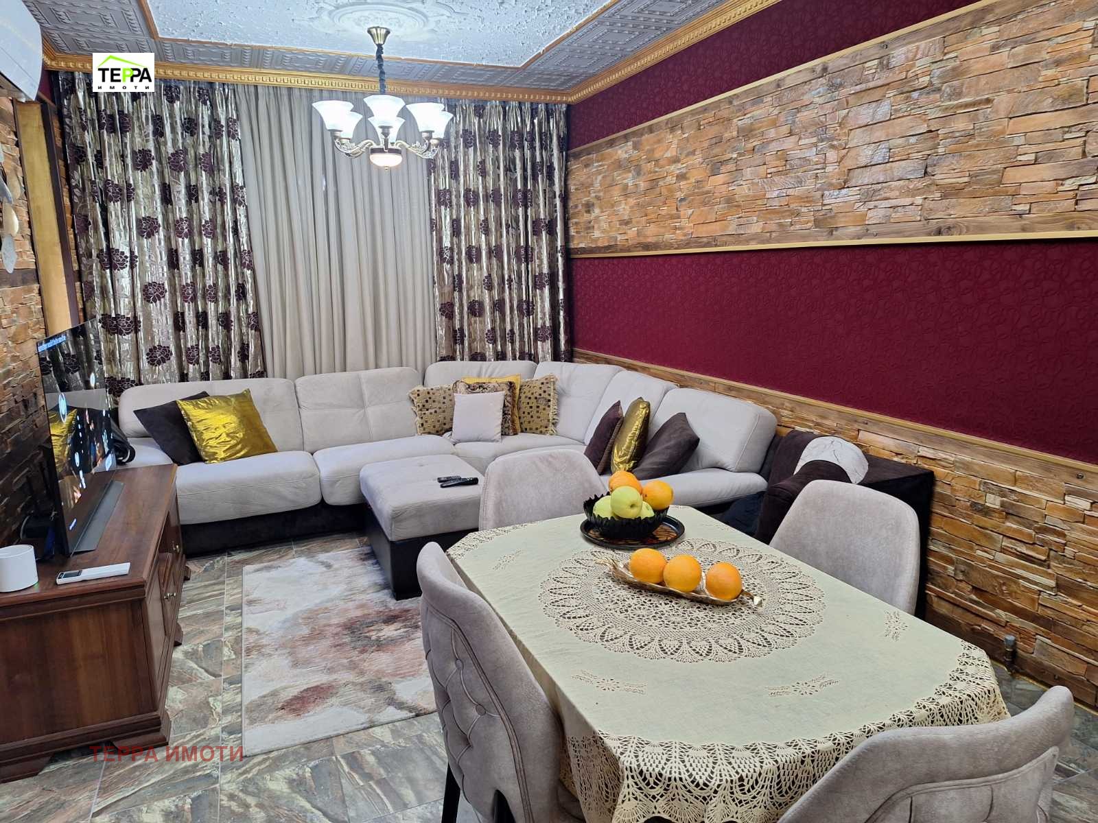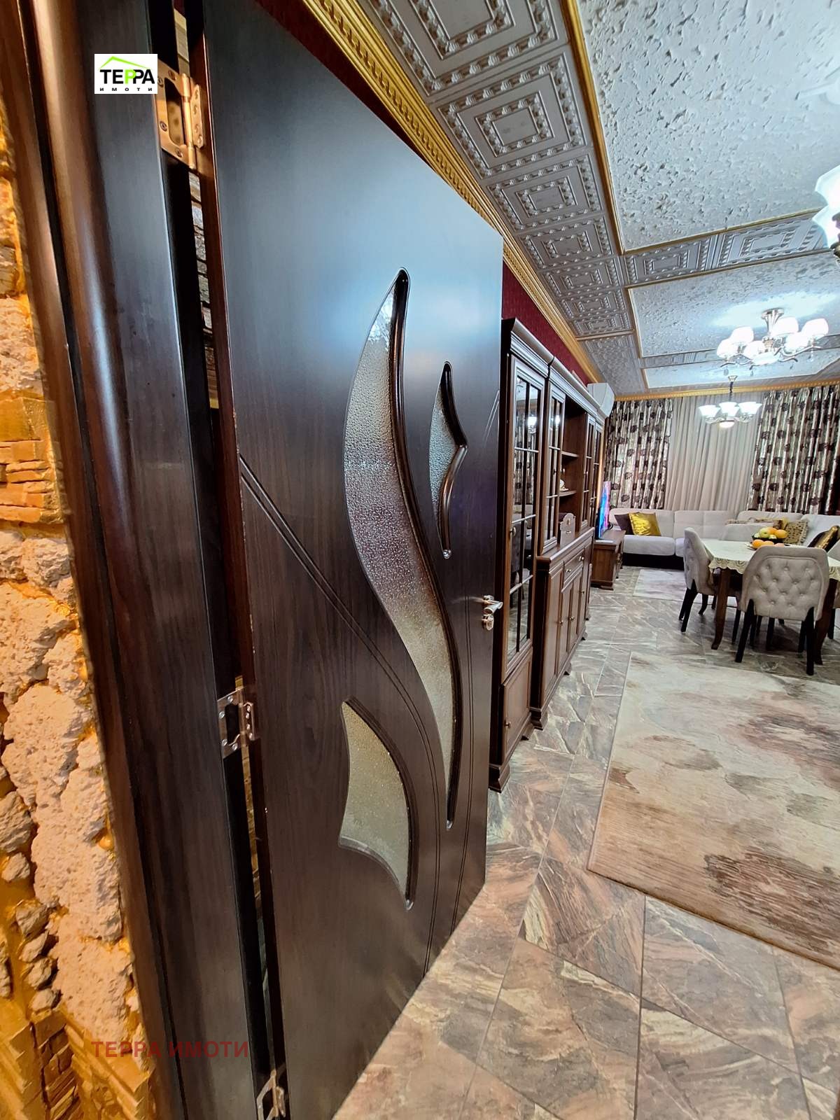 ТЕРРА ИМОТИ имаме удоволствието да Ви представим за продажба, нов тристаен апартамент, в източната част на гр.Стара Загора, в близост до фабрика Наталия!Жилището е разположено на трети жилищен етаж, в новопостроена жилищна сграда, с площ 97 кв.м.Състои се от дневна-трапезария с кухненски бокс, две спални, коридор, две бани и две тоалетни, мокро помещение, една тераса.Изложение юг-запад.Жилището се радва на множество удобства и екстри!Тристайното жилище прави впечатление с бутиковото решение на своите стаи и обзавеждането по индивидуален проект!В обзавеждането са използвани материали и брандове от най-висок клас!Дизайнерски обзаведен, апартаментът е оборудван и с висок клас електроуреди.Продава се с високачествени настилки, италиански гранитогрес, окачени тавани, дизайнерски елементи -декоративни камъни, осветителни тела, висок клас интериорни врати,висок клас енергоспестяващи климатици-подов Daikin Perfera и Mitsubishi Eiectrik,смарт ТВ в трите стаи, хладилник Bosch ,керамични котлони и готварска фурна Miele,пералня и сушилня Bosch.Апартаментът е с алуминиеви ролетни щори с комарници, дистанционно управляеми.В имота има и извод на газ!