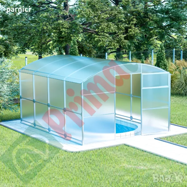 Покривалото за басейн (тип павилион) предпазва водата от листа и боклуци, задържа топлината и осигурява безопасност за деца и домашни любимци.