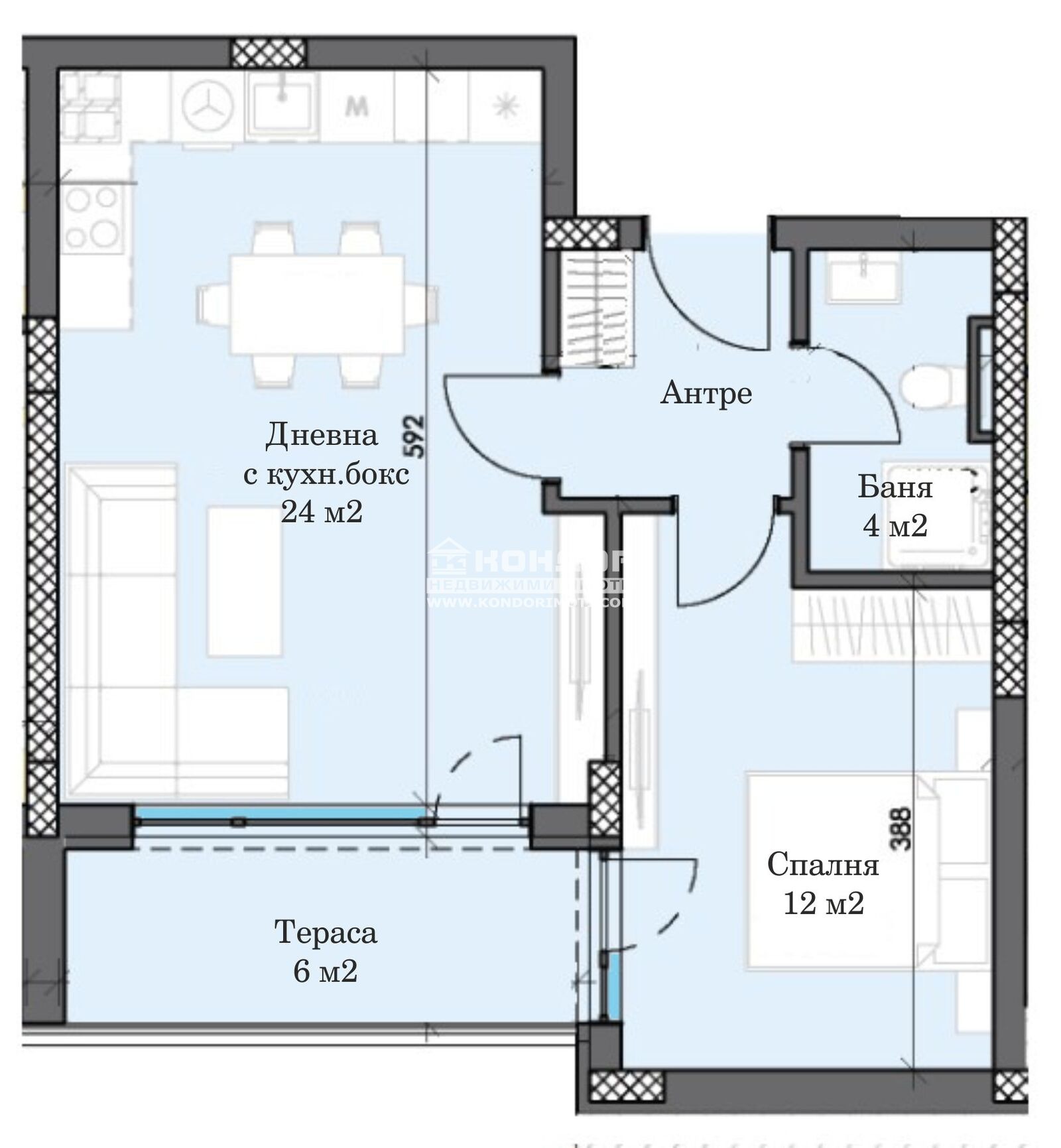 Оферта 66824: Предлагаме Ви възможността да закупите двустаен апартамент с изцяло ЮЖНО изложение в новоизграждащ се луксозен жилищен комплекс с модерна визия, проектиран да създаде максимален комфорт на живущите в него. Функционално разположени жилищни секции с елегантен силует готов да предложи комфорт и модерен начин на живот. Едно от основните му предимства е страхотната локация, отлична комуникативност и динамична пътна инфраструктура, която осигурява бърз и лесен достъп до комплекса от всяка точка на града. Той съчетава лукс, спокойствие и комфорт с подсигурени паркоместа и гаражи. Жилището се състои от дневна 24кв.м. с кухненска част и трапезария, една самостоятелна спалня 12.47кв.м., баня с тоалетна, входно антре и една обща тераса. Основната концепция при проектирането е да се постигнат просторни и функционални стаи, с цел да се създаде максимален уют на модерното семейство. Изключителна съвременна архитектура и модерна технология на строителство. Визията е иновативна, привличаща внимание с уникалността си. Всяко жилище ще разполага с пълно окабеляване за домофон, интернет и кабелна телевизия, общите части са луксозно завършени, жилищата са с алуминиева дограма с троен стъклопакет от най-висок клас, масивна блиндирана входна врата. За удобство на живущите съществува възможността да закупят подземни паркоместа и гаражи с топла връзка към комплекса. Гъвкави схеми на разсрочено плащане спрямо възможностите на клиента в рамките на строителството или закупуване чрез Банков Кредит, на изключително изгодни условия за клиенти на агенцията !!! Приложените изображения са от завършени проекти на строителната фирма.ВИЖТЕ ОЩЕ ИЗГОДНИ ОФЕРТИ НА https://www.kondorimoti.com/ С ЕЖЕДНЕВНА АКТУАЛИЗАЦИЯ!