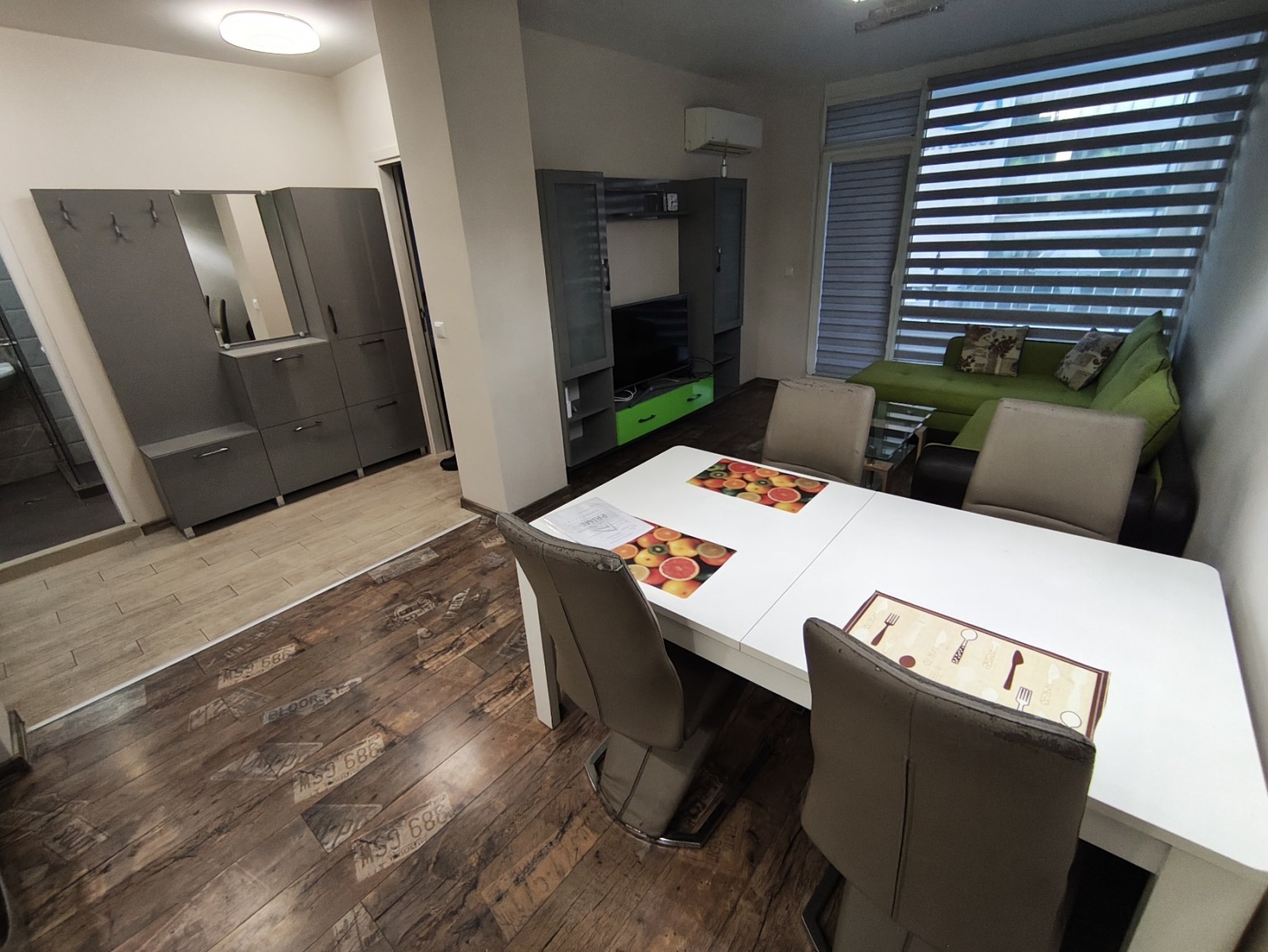Модерно обзаведен двустаен апартамент под наем, намиращ се в нова сграда до хотел Мираж, в ж.к. Славейков. Жилището е обзаведено със стил и внимание към детайла. Състои се от голям хол с кухня и трапезария /вече има трапезна маса с 4 стола/, спалня, баня с тоалетна и душ кабина и приятна тераса с гледка. Мебелите са нови. Разполага с висок клас електроуреди, включително миялна машина, чисто нов плазмен телевизор, който не се вижда на снимките и климатици в двете стаи. Сградата е с добре поддържани общи части. С включено в цената паркомясто в подземния паркинг на сградата (оборудван с асансьор за коли).