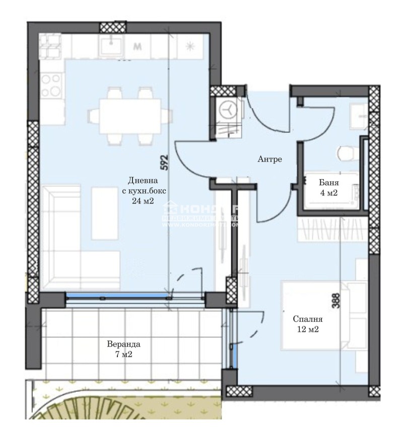 двустаен апартамент с изцяло южно изложение в новоизграждащ се луксозен жилищен комплекс с модерна визия, проектиран да създаде максимален комфорт на живущите в него. Функционално разположени жилищни секции с елегантен силует готов да предложи комфорт и модерен начин на живот. Едно от основните му предимства е страхотната локация, отлична комуникативност и динамична пътна инфраструктура, която осигурява бърз и лесен достъп до комплекса от всяка точка на града. Той съчетава лукс, спокойствие и комфорт с подсигурени паркоместа и гаражи. Жилището се състои от дневна 24кв.м. с кухненска част и трапезария, една самостоятелна спалня 12.47кв.м., баня с тоалетна, входно антре с място за перално и веранда 7кв.м. Основната концепция при проектирането е да се постигнат просторни и функционални стаи, с цел да се създаде максимален уют на модерното семейство. Изключителна съвременна архитектура и модерна технология на строителство. Визията е иновативна, привличаща внимание с уникалността си. Всяко жилище ще разполага с пълно окабеляване за домофон, интернет и кабелна телевизия, общите части са луксозно завършени, жилищата са с алуминиева дограма с троен стъклопакет от най-висок клас, масивна блиндирана входна врата. За удобство на живущите съществува възможността да закупят подземни паркоместа и гаражи с топла връзка към комплекса. Гъвкави схеми на разсрочено плащане спрямо възможностите на клиента в рамките на строителството или закупуване чрез Банков Кредит, на изключително изгодни условия за клиенти на агенцията !!! Приложените изображения са от завършени проекти на строителната фирма.ВИЖТЕ ОЩЕ ИЗГОДНИ ОФЕРТИ НА https://www.kondorimoti.com/ С ЕЖЕДНЕВНА АКТУАЛИЗАЦИЯ!