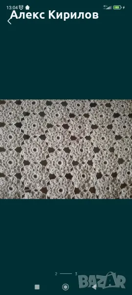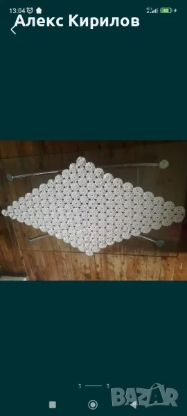 Карето е без забележка,много красиво, ръчно плетено на една кука.Рамери дължина-126см. шир.70см.Цвета му е мръсно-бяло,към екрю.