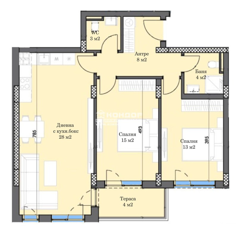 Оферта 66836: Предлагаме Ви възможността да закупите тристаен апартамент в новоизграждащ се луксозен жилищен комплекс с модерна визия, проектиран да създаде максимален комфорт на живущите в него. Функционално разположени жилищни секции с елегантен силует готов да предложи комфорт и модерен начин на живот. Едно от основните му предимства е страхотната локация, отлична комуникативност и динамична пътна инфраструктура, която осигурява бърз и лесен достъп до комплекса от всяка точка на града. Той съчетава лукс, спокойствие и комфорт с подсигурени паркоместа и гаражи. Жилището се състои от просторна дневна/28кв.м./ с кухненска част и трапезария, две самостоятелни спални с площ от 13 и 15кв.м., баня с тоалетна, втора тоалетна, входно антре с място за гардероб и една тераса. Основната концепция при проектирането е да се постигнат просторни и функционални стаи, с цел да се създаде максимален уют на модерното семейство. Изключителна съвременна архитектура и модерна технология на строителство. Визията е иновативна, привличаща внимание с уникалността си. Всяко жилище ще разполага с пълно окабеляване за домофон, интернет и кабелна телевизия, общите части са луксозно завършени, жилищата са с алуминиева дограма с троен стъклопакет от най-висок клас, масивна блиндирана входна врата. За удобство на живущите съществува възможността да закупят подземни паркоместа и гаражи с топла връзка към комплекса. Гъвкави схеми на разсрочено плащане спрямо възможностите на клиента в рамките на строителството или закупуване чрез Банков Кредит, на изключително изгодни условия за клиенти на агенцията !!! Приложените изображения са от завършени проекти на строителната фирма.ВИЖТЕ ОЩЕ ИЗГОДНИ ОФЕРТИ НА https://www.kondorimoti.com/ С ЕЖЕДНЕВНА АКТУАЛИЗАЦИЯ!