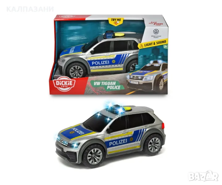 Полицейски VW Tiguan R-Line: мощен SUV автомобил за реакция. Dickie Toys придава ново лице на познатите модели автомобили. Немската полицейска версия VW Tiguan R-Line е моделирана по оригинала в пълен размер с голямо внимание към детайла и оборудвана за операции в детската стая. С натискането на един бутон играчката кола със свободен ход в мащаб 1:18 създава автентични светлинни и звукови ефекти. Необходимите батерии вече са включени. Полицейският VW Tiguan R-Line е идеалният колекционерски екземпляр за малки фенове на моторите от тригодишна възраст.