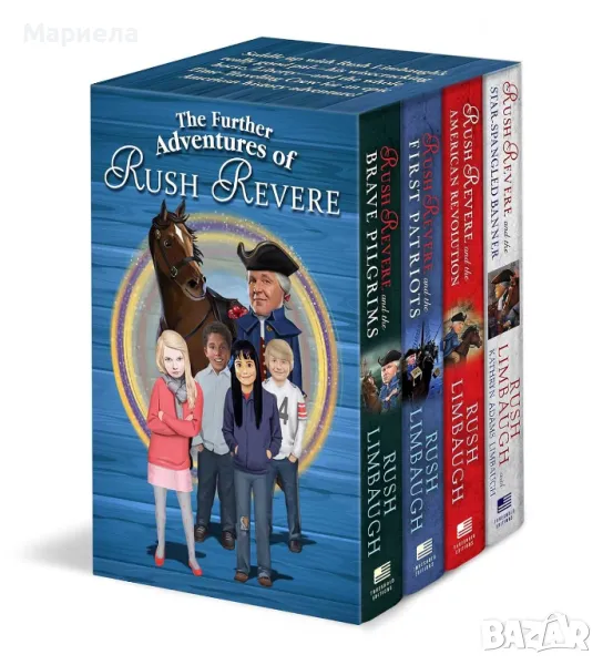 Разгледайте най-ранните дни на Съединените щати с този комплект от поредицата „Пътешествия във времето с изключителни американци“ от Ръш Лимбо, бестселър номер 1 на „Ню Йорк Таймс“ ! Милиони млади читатели са се возили с Ръш Ривиър и неговия верен кон Либърти. Сега, в това специално издание в кутия, можете да се насладите на четирите бестселъра, приключения през историята на нашата нация. Rush Revere and the Brave Pilgrims: Върнете се в началото, като се присъедините към кораб, пълен със смели семейства, пътуващи на кораба Mayflower през 1620 г. Това беше доста страхотно време и ще изпитате точно това, което са правили те по време на онова грубо и опасно океанско пътуване. Заедно ще зададем на поклонниците всички наши въпроси, ще разберем как живеят, ще се присъединим към тях на първия Ден на благодарността и много други. Ръш Ривиър и първите патриоти: Присъединете се към Ръш и неговите приятели във второто приключение по оживените улици на Бостън през 1765 г., където разговорите за революция стават все по-силни. Ще срещнете яростни поддръжници на свободата като Самюъл Адамс, Бенджамин Франклин и моя идол Пол Ривиър, докато те безстрашно се противопоставят на британското управление. Ръш Ривиър и Американската революция: Върнете се назад в историята към пропастта на Американската революция, когато бунтът витае във въздуха. Ще видим два фенера, окачени в църквата „Олд Норт“, ще предотвратим залавянето на Пол Ривиър от британски шпионин и ще се справим с опасността в битките при Лексингтън, Конкорд и Бънкър Хил. Ръш Ривиър и Звездно-осеяното знаме: Върнете се в седлото с Ръш Ривиър, докато той изследва първите дни на Америка като нация. Ръш и младите му приятели се срещат с Джеймс Мадисън, докато пише Конституцията, и с Франсис Скот Кий, докато пише националния химн по време на битката за Балтимор.