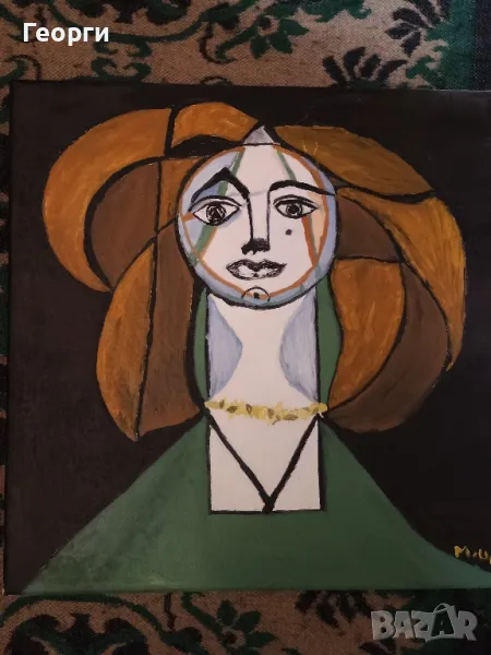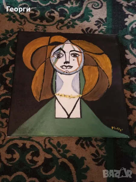 Много красива картина реплика копие на Пикасо.Мисля че картината изобразява жена му.Картината е рисувана с бои(не знам какви)на платно.Размери 40 на 40 сантиметра.
