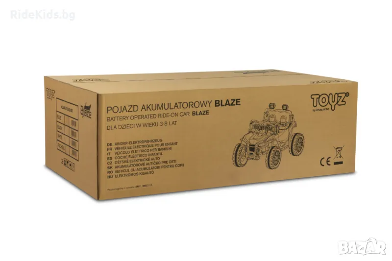 Blaze е акумулаторен офроуд автомобил, който ще осигури страхотно забавление на две деца. Сигурността при шофиране се осигурява от удобна седалка от еко кожа, оборудвана с 2 комплекта 3-точкови колани. Окачването на автомобила е обогатено с 4 амортисьора, които ще ви помогнат да преминете през неравни терени, което в комбинация с колела от EVA пяна гарантира изключителен комфорт при шофиране. Blaze е оборудван с LED светлини, разположени в предната част на автомобила и на гредата над главите на пътниците. Реализъм по време на игра ще бъде добавен от елементи като отваряща се врата с дръжка, повдигащ се капак и отворен багажник в задната част на автомобила. Blaze се захранва от 4 45W мотора, захранвани от една батерия 12V10Ah. Родителите на по-малки деца могат дистанционно да управляват автомобила с помощта на включения безжичен контролер. Играта с Blaze ще бъде по-приятна от мултимедиен панел с USB и Bluetooth.