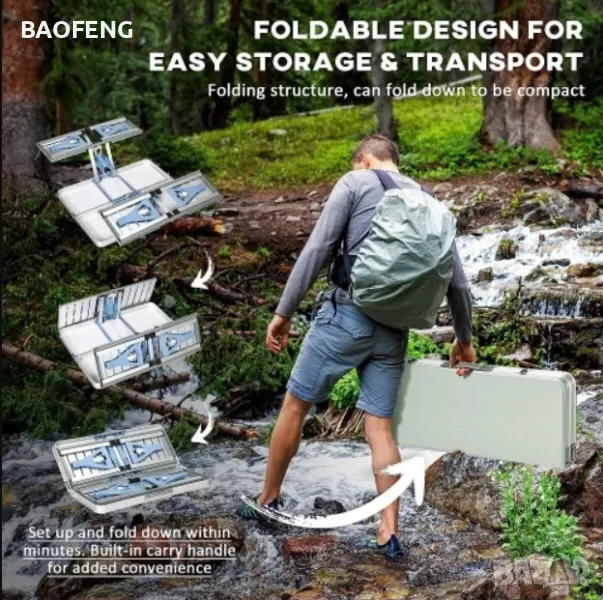 В сгънато състояние масата се превръща в куфар с дръжка, лека и практична, няма да се превърне в обременяващ товар и значително ще улесни вашата почивка. Повърхността на плота е меламин, който има водоотблъскващи свойства и е устойчив на всякакви механични повреди: драскотини, чипове и др.