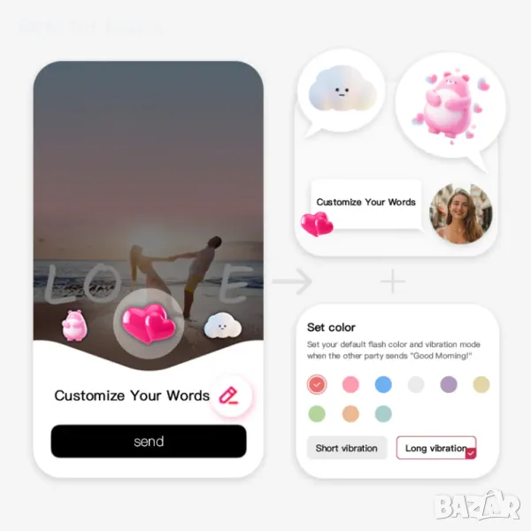 Гривните Totwoo създават интимно и лично пространство за вас и вашия специален човек. Светлините и напомнянията не само ще ви помогнат да се чувствате свързани, но и ще имате място да изразите любовта си чрез снимки, видеоклипове, аудио и текст в приложението Totwoo. След като партньорът ви докосне бижуто, ще се появи изненадващо съобщение, придружено от вибрацията на бижуто и то ще светне. Можете дори да разговаряте с любимия човек в приложението Totwoo.