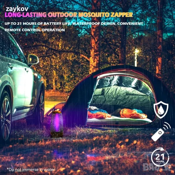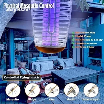 Удобно дистанционно управление и устойчив на атмосферни влияния дизайн: Безжичното дистанционно управление прави работата лесна, позволявайки ви да го включвате или изключвате от разстояние. Със своята устойчива на атмосферни влияния конструкция, този капан за насекоми работи надеждно дори във влажни или мокри условия, което го прави идеален за вътрешни дворове, тераси и къмпинги.