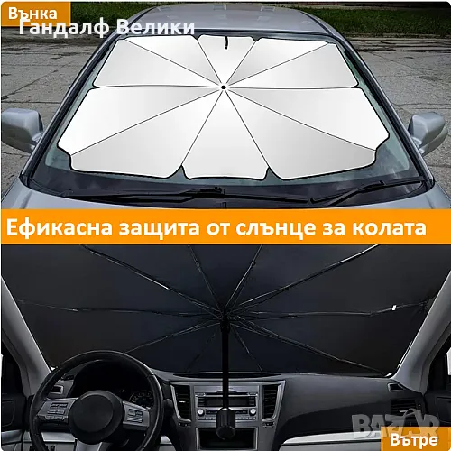 Защитете автомобила от силно нагряване със компактен слънцезащитен сенник за кола тип чадър с UV защита. Практично решение за всека кола. Лесен за съхранение и използване.