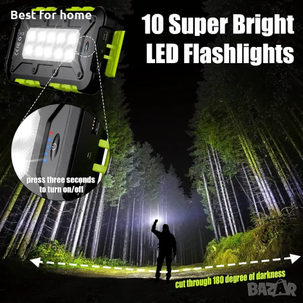 Соларно зарядно за телефон с 10 ярки LED фенерчета и LED фенерчета с постоянна светлина. Идеално за всякакви случаи на открито.