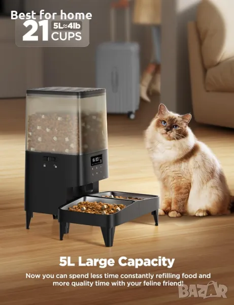 [Здравословен график за хранене] Настройте до 6 хранения на ден с 1–48 порции всяко, използвайки 5-литрова автоматична хранилка за котки за здравословна диета. (1 порция ≈10 г) Диспенсърът за котешка храна ви покрива в случай на прекъсване на захранването с локална настройка на паметта и режим на захранване от резервна батерия. Вашата котка никога няма да остане гладна и няма да е нужно да започвате отначало, когато захранването спре.