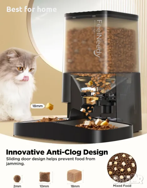 [2024 г. - гениален механизъм против запушване] В хранилката за котки FEELNEEDY е поставена плъзгаща се врата, специално проектирана за работа с гранули от 3 до 18 мм, която побира гранули, пелети, лиофилизирани храни и други, без да се запушва, осигурявайки безпроблемно хранене за собствениците на котки.