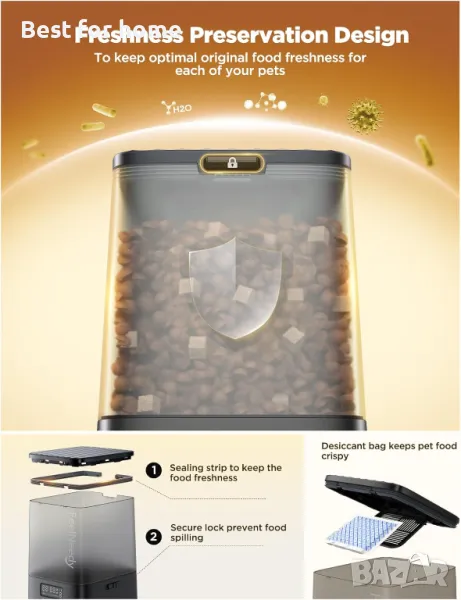 [Запазва хрупкавостта и предотвратява палавите лапи] Сигурен капак с натискане, за да предпази домашните любимци от кражба на храна. Включени са запечатваща лента и торбичка с влагоабсорбатор, за да се запази храната изкусително суха и ароматна. Впечатляващият капацитет за съхранение от 5 литра ви позволява да прекарвате по-малко време в постоянно допълване на храна и повече качествено време с вашия котешки приятел.