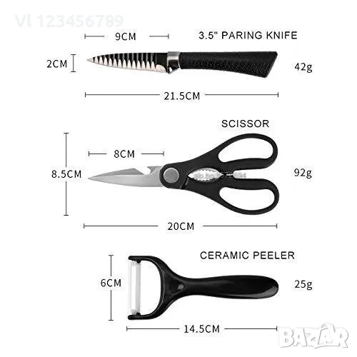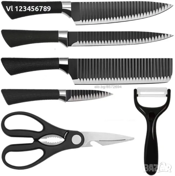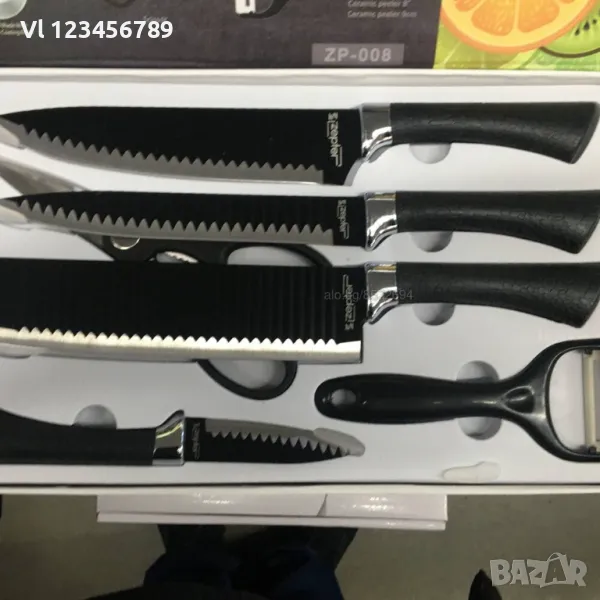 Нов комплет от 4 ножа, белачка, домакинска ножица.