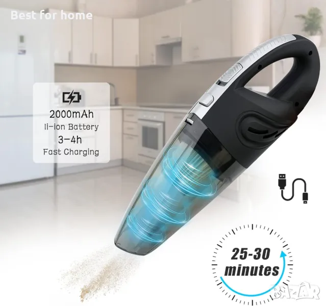 【Ефективно зареждане и безопасност】Безжичната ръчна прахосмукачка е оборудвана с батерии с голям капацитет 2200 mAh и се зарежда бързо само за 3-4 часа. След пълно зареждане може да работи непрекъснато 25-30 минути, почистването става ефективно и удобно. (Забележка: моля, изключвайте я, когато зареждате)