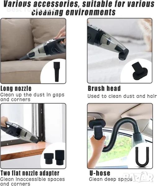 【Професионални инструменти за почистване】8 в 1 мощна ръчна прахосмукачка с няколко функционални аксесоара: Удължени U-образни маркучи, комбинирани с глава на четката, можете да почистите всеки ъгъл на колата си. Дълга дюза за почистване на пукнатини и ъгли от прах. Миещ се HEPA филтър. 2* плоски дюзи за преобразуване, почистващи труднодостъпни места и ъгли. Четка за прах за събиране на коса или мръсотия от деликатни повърхности и тапицерия. 1 USB зарядно устройство, 1 ръководство за потребителя. 1x ръчна прахоуловителка.