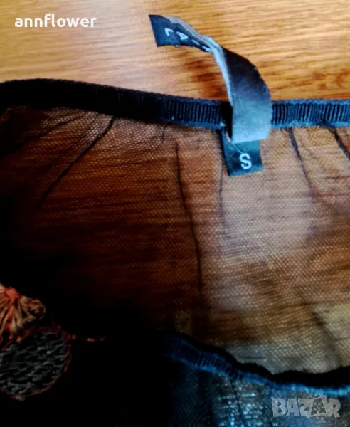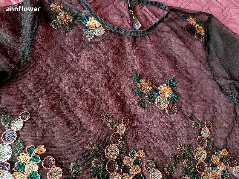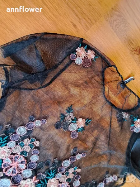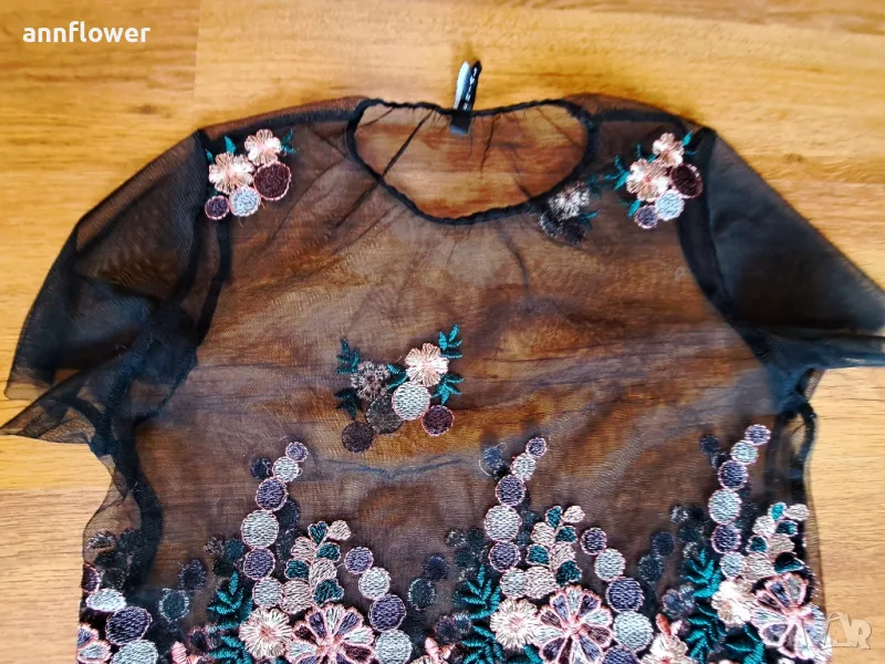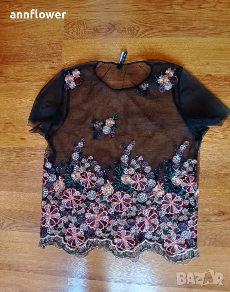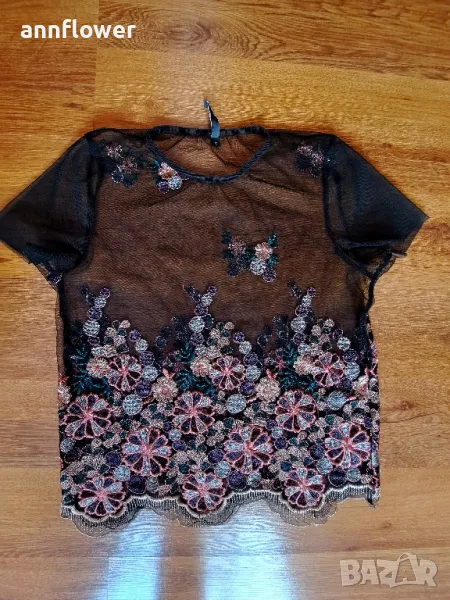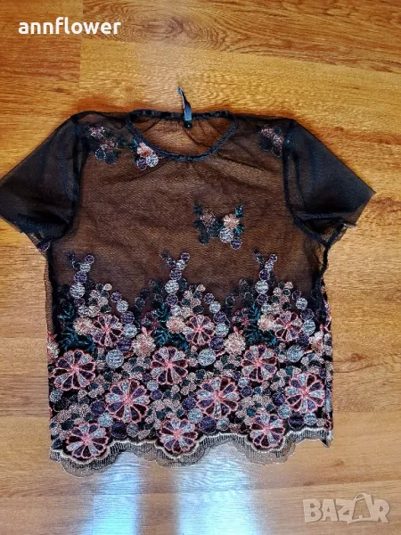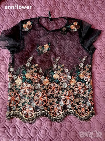 Много красива тениска, като нова и оригинална. Материя черен тюл със страхотна бродерия. Размер S , дължина 54см ширина в раменете 34см, ширина в мишниците 44см.