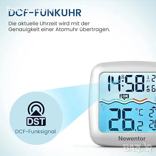 Базова станция с допълнителни функции: показване на високи/ниски стойности, разширяема до 3 термометъра за басейн, автоматична синхронизация на времето с радиосигнал. Просто поставете батериите (не са включени) и сте готови.