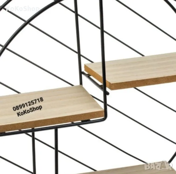 Кръгла метална етажерка, с дървени рафтове.Размери:Диаметър:30 см.Дълбочина:9 см.