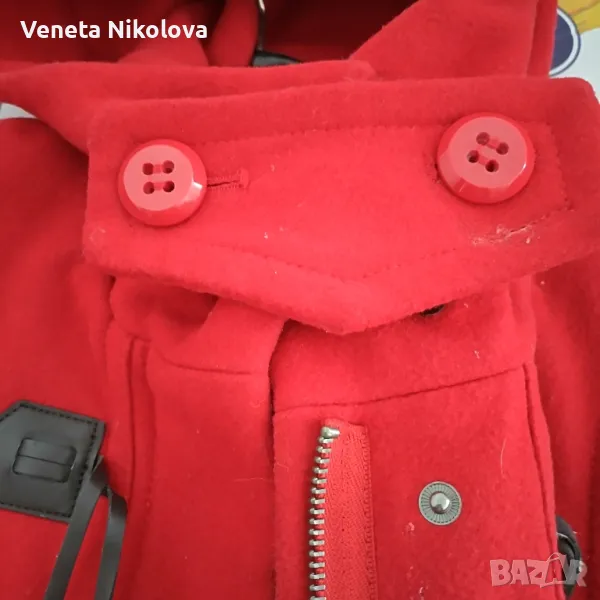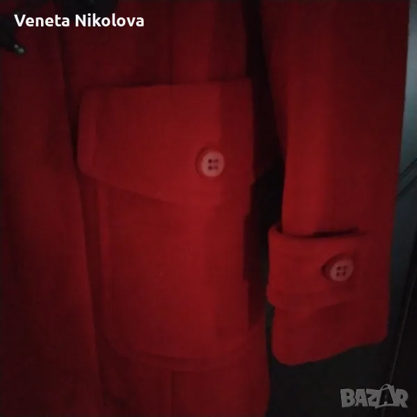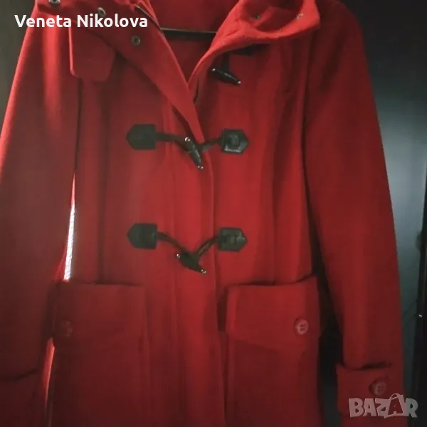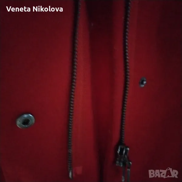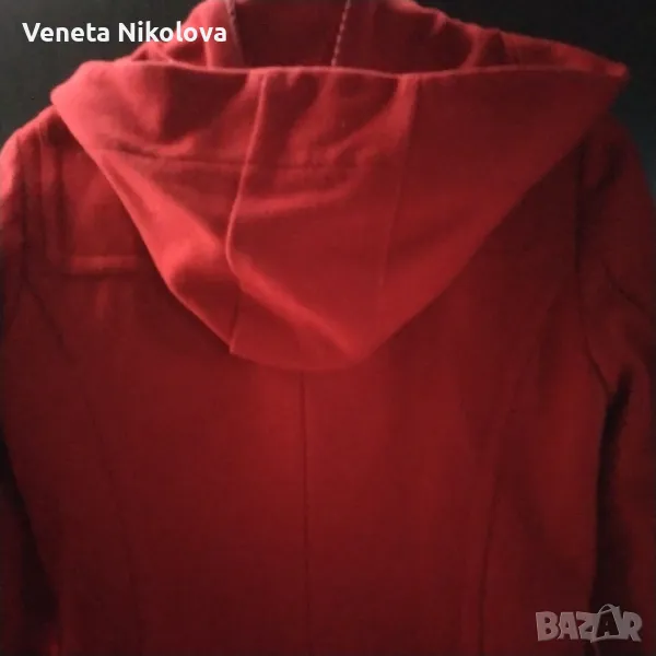 Дамско палто с качулка, червено. 60о/о вълна, 30о/о полиестер, 10о/о вискоза. Подплата 100о/о полиестер. Дължина 73см, ръкав 60см, ширина на гърба при раменете 40см. Дължина на ципа 52см. С два външни джоба.