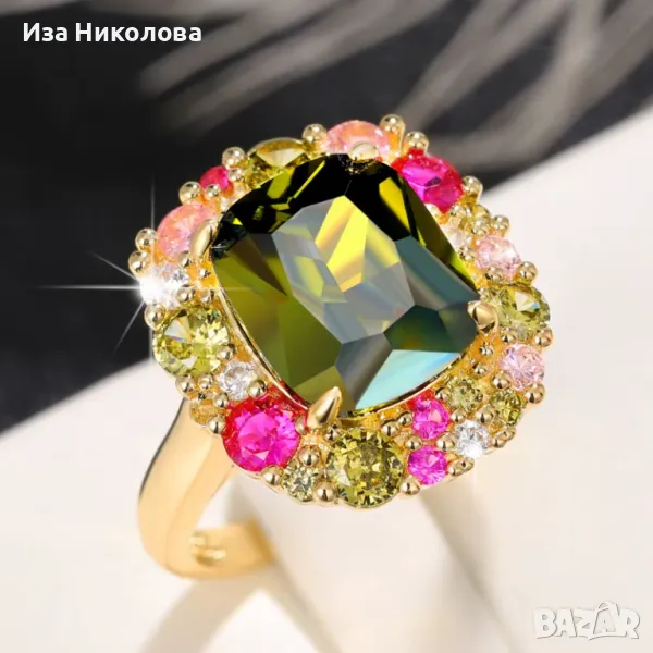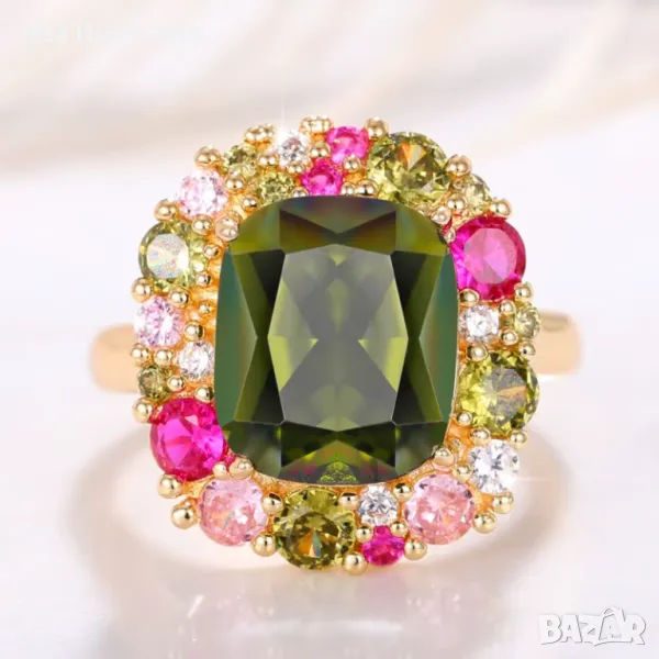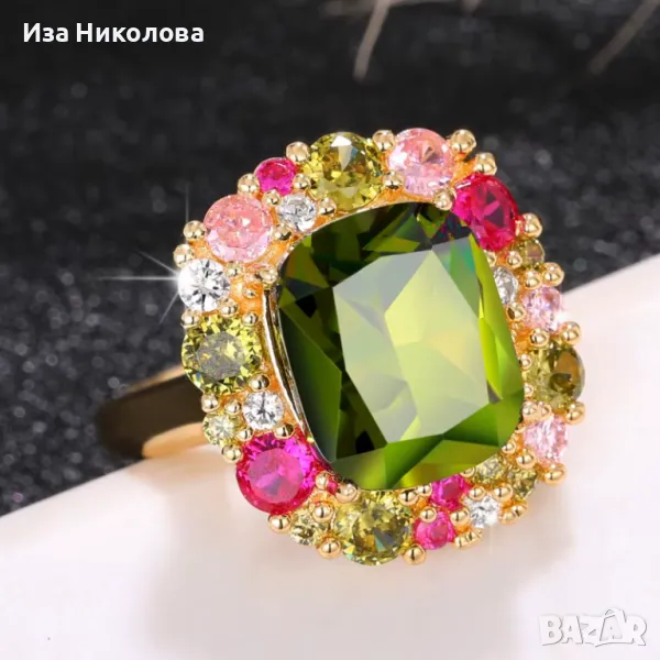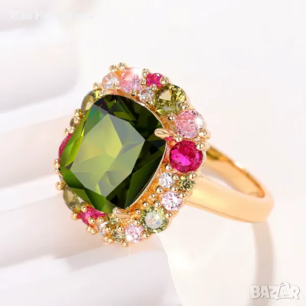 Пръстен със златно покритие, голям смарагд в средата, заобиколен от многоцветни сапфири, размери 9 и 10.