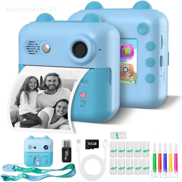 Незабавен печат от детска камера, 1080P HD цифров фотоапарат за деца с 11 ролки хартия за печат, 64G TF карта, 5 цветни химикалки, моментална камера, видеорекордер, камера за подарък, подходяща за момчета и момичета
