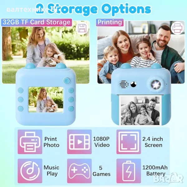 [Камера за незабавен печат за деца]: Тази забавна камера за незабавен печат за деца е предназначена за деца и се предлага с 3 ролки хартия за печат, което им позволява незабавно да отпечатват черно-бели снимки само за 1 секунда. Камерата за незабавен печат за деца използва технология за термичен печат, елиминирайки необходимостта от мастило и тонер касети. Тази камера ви позволява да съхранявате цветни снимки на SD карти, предлагайки неограничени възможности за фотографската кариера на вашето дете.