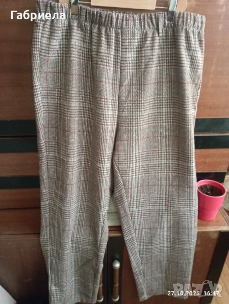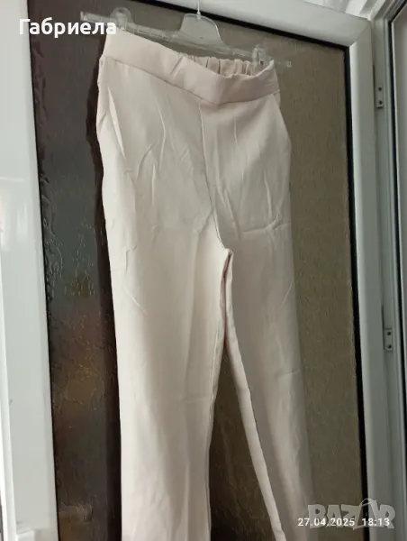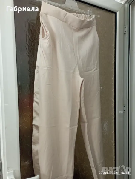елегантен дамски костюм в бежов цвят. Подходящ за специални поводи и официални събития. Изискан дизайн и внимателно изработени детайли. Панталона е с ластик и кант. Отговаря на размер хл. Ханш двустранно разтегливо положение 76 см., гръдна обиколка около 102 см.