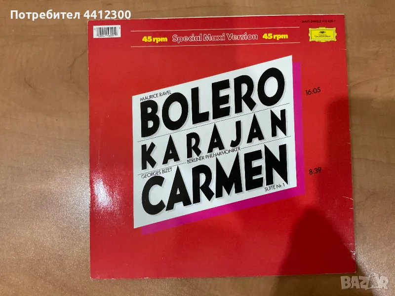 Здравейте, грамофонна плоча 12 инча Bolero Karajan carmen. Не нося отговорност за състоянието на плочите, не почиствам плочи. Вие поемате риск, когато закупувате от мен, ако имате въпроси, може да ми звънете на посочения номер или да ми напишете съобщение. Отговарям след 18 часа, цените не се коментират, ако не се вземат повече от 10 плочи. Благодаря, че прегледахте обявата ми. Лек и спокоен ден!