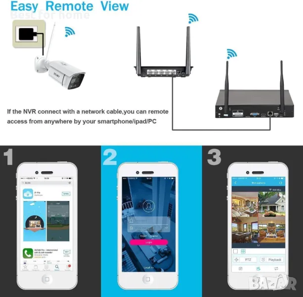 WiFi IP камерите могат да се свържат много бързо по 2 начина (свързване към Wi-Fi, свързване към LAN), за да се гарантира свързването на охранителни камери. Може да се осъществява и дистанционно стрийминг на видео в реално време чрез смартфон, таблет и компютър.